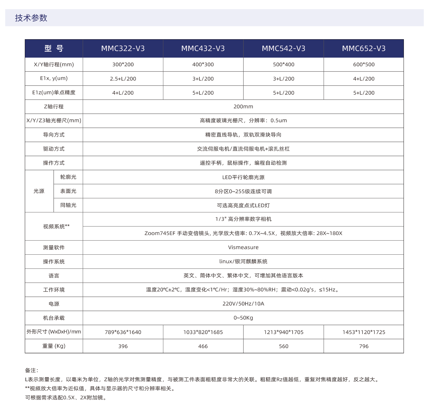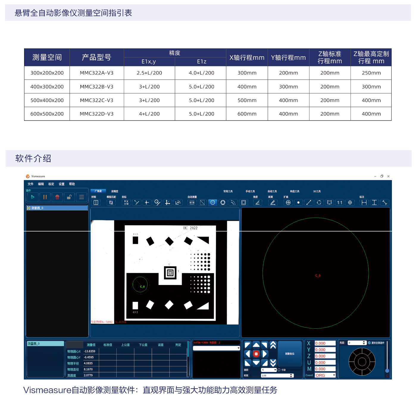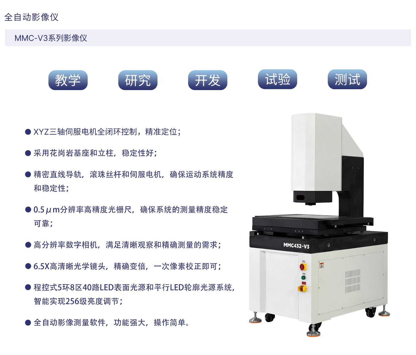 MMC-V3系列是本公司推出的一款全自动影像仪。X/Y/Z三轴采用伺服电机全闭环控制,实现高精度定位与运动控制。设备基座与立柱均选用优质花岗岩材料,具备优异的热稳定性和机械稳定性。运动系统配置精密直线导轨、滚珠丝杆及伺服电机,保障了高速运行中的精度与平稳性。配备0.5μm分辨率的高精度光栅尺,为测量数据稳定可靠提供坚实基础。搭载高分辨率数字相机,可清晰成像,满足各类精密测量需求;配合6.5X高清晰光学镜头,变倍精准,仅需一次像素校正,操作高效便捷。集成程控式5环8区40路LED表面光源与平行轮廓光源系统,支持256级亮度智能调节,适应不同工件照明需求。配套全自动影像测量软件,功能全面强大,界面简洁易用,可实现多种复杂工件的精确高效测量。