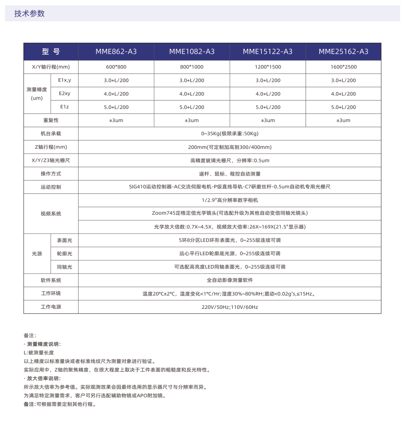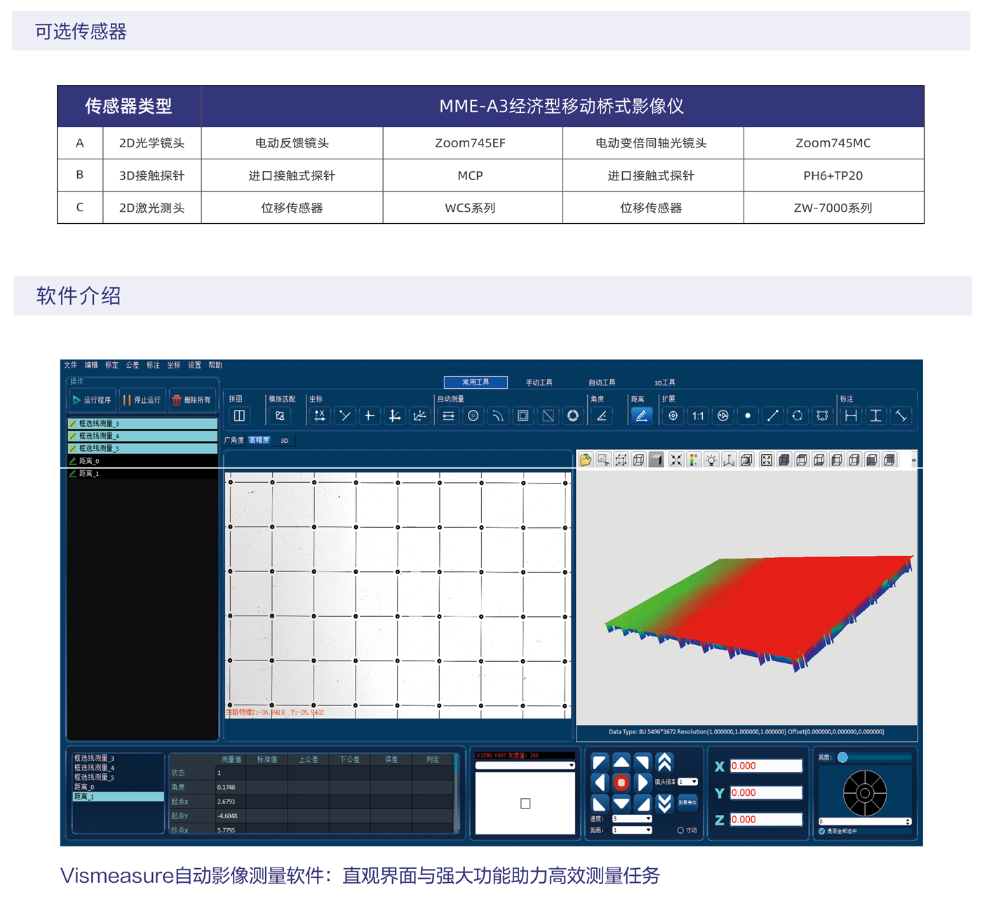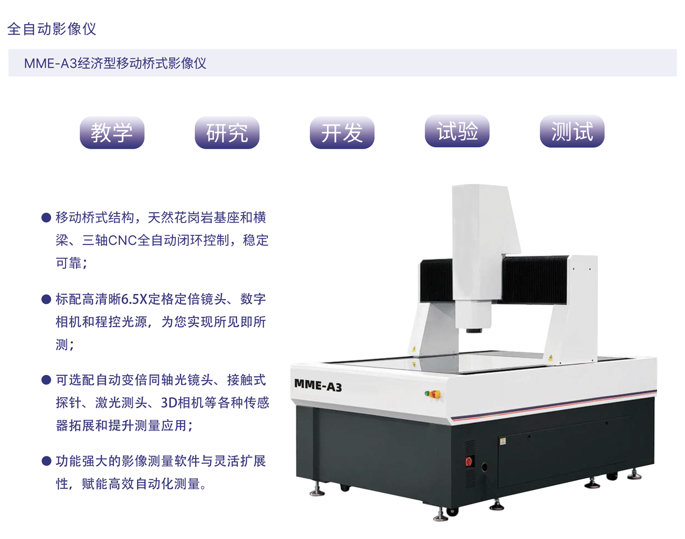 MME-A3系列是一款经济型移动桥式全自动影像测量仪产品,专为高精度和大尺寸测量而设计。采用移动桥式结构,测量工件固定不动,保证测量精度和稳定性,适用于半导体、3C电子,医疗器械,LCD和航空航天等行业。