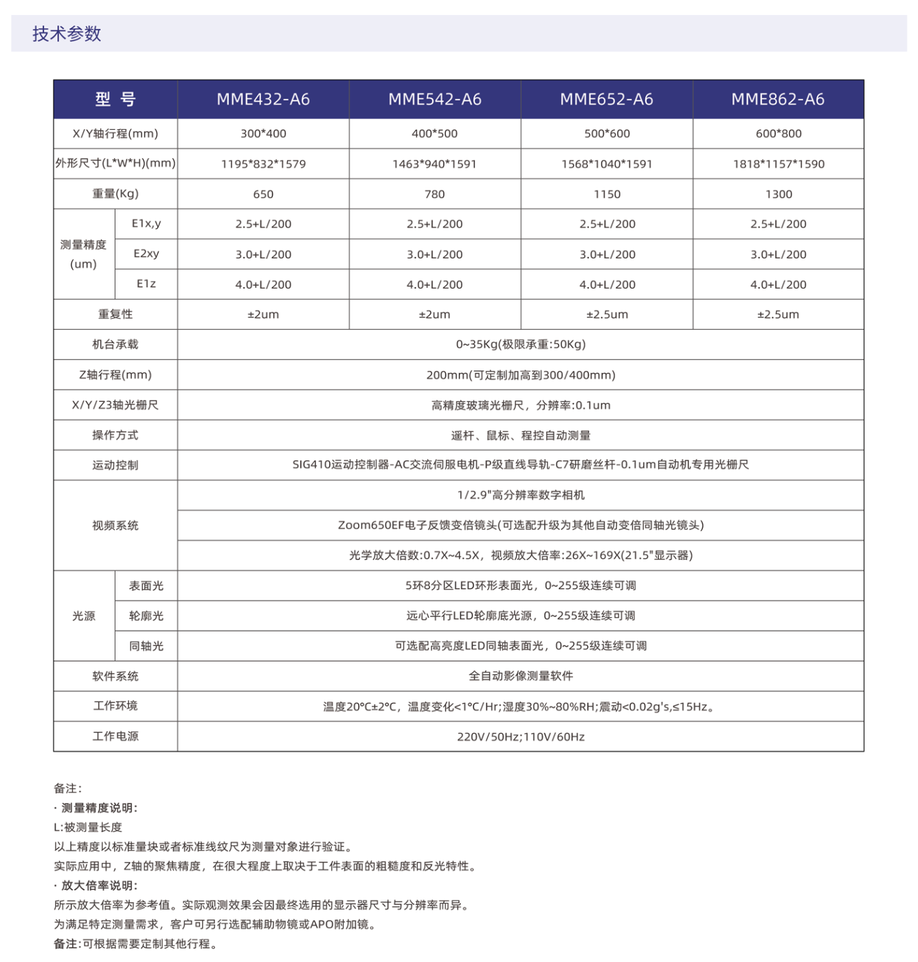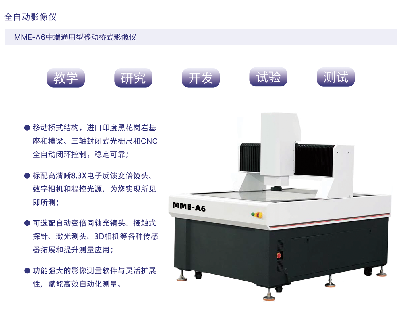 MME-A6系列是一款高精度移动桥式全自动影像测量仪产品,专为高精度和大尺寸测量而设计。采用移动桥式结构,测量工件固定不动,保证测量精度和稳定性,适用于半导体、3C电子,医疗器械,LCD和航空航天等行业。