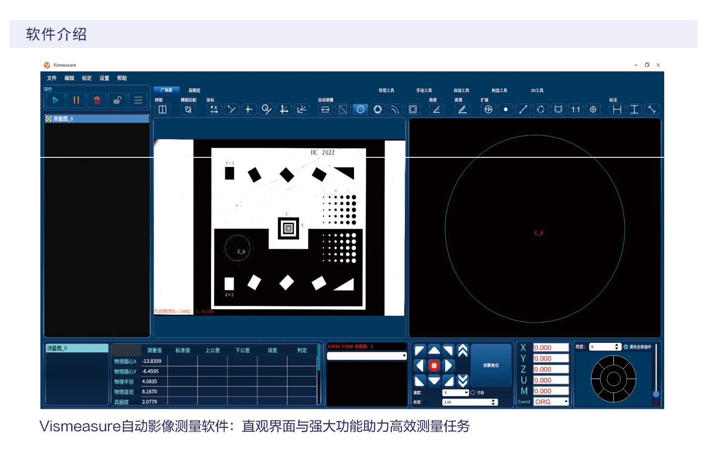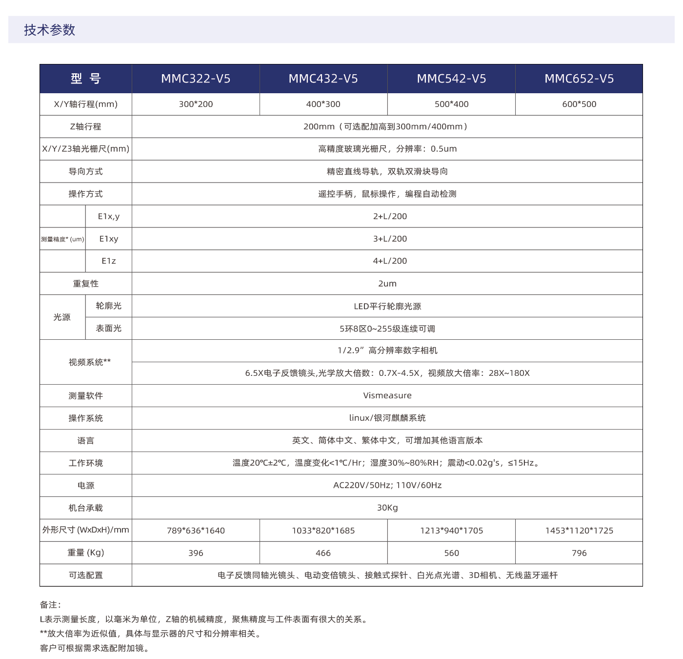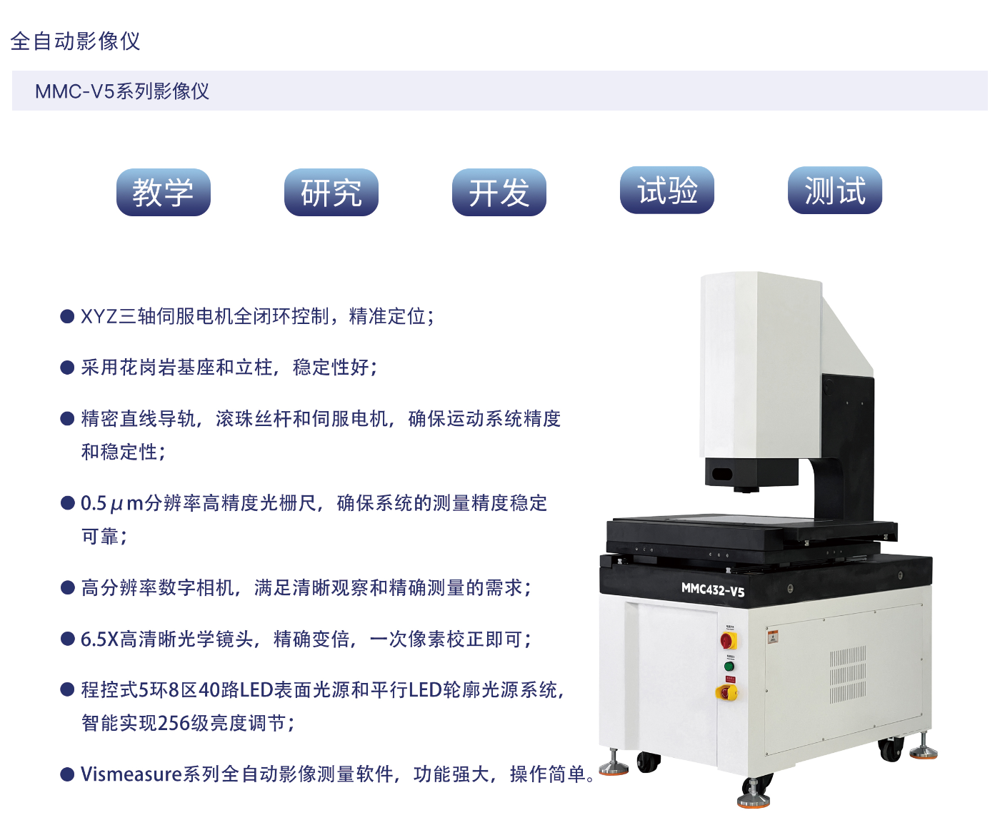 MMC-V5系列是本公司推出的一款全自动影像仪。X/Y/Z三轴采用伺服电机全闭环控制,实现高精度定位与运动控制。设备基座与立柱均选用优质花岗岩材料,具备优异的热稳定性和机械稳定性。运动系统配置精密直线导轨、滚珠丝杆及伺服电机,保障了高速运行中的精度与平稳性。配备0.5μm分辨率的高精度光栅尺,为测量数据稳定可靠提供坚实基础。搭载高分辨率数字相机,可清晰成像,满足各类精密测量需求;配合6.5X高清晰光学镜头,变倍精准,仅需一次像素校正,操作高效便捷。集成程控式5环8区40路LED表面光源与平行轮廓光源系统,支持256级亮度智能调节,适应不同工件照明需求。配套全自动影像测量软件,功能全面强大,界面简洁易用,可实现多种复杂工件的精确高效测量。