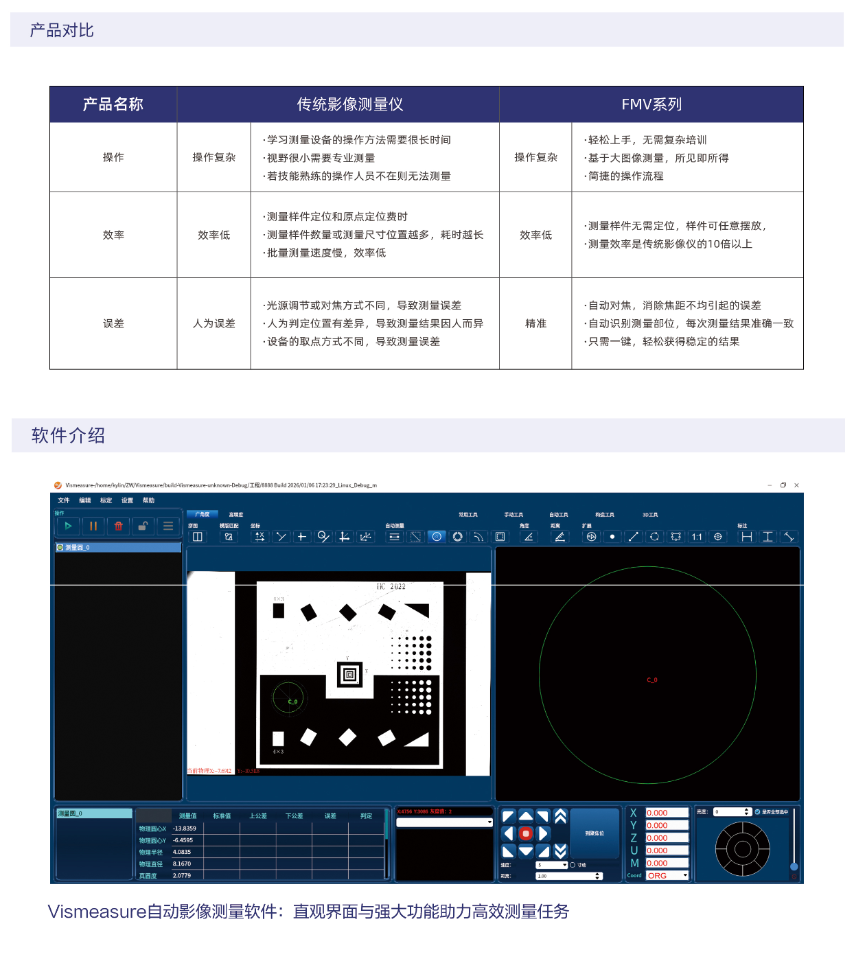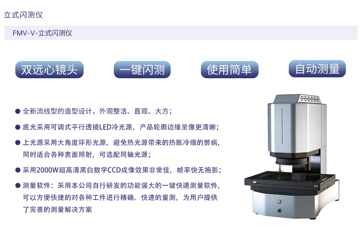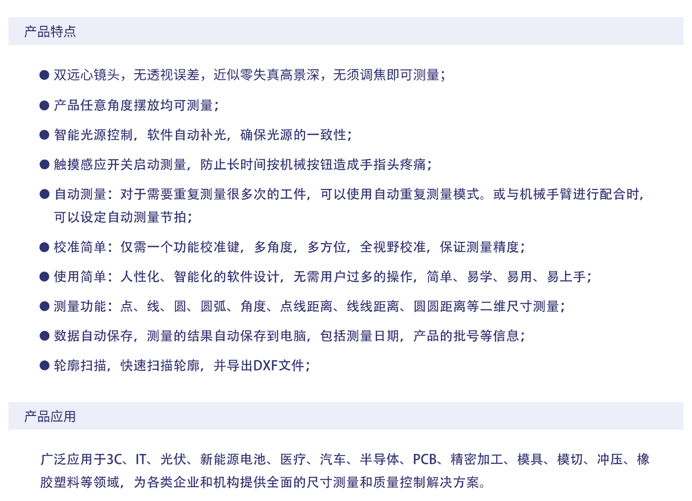 全新流线型的造型设计,外观整洁、直观、大方,底光采用可调式平行透镜LED冷光源,产品轮廓边缘呈像更清晰;上光源采用大角度环形光源,避免热光源带来的热胀冷缩的弊病,同时适合各种表面照射,可选配同轴光源;采用2000W超高清黑白数字CCD成像效果非常佳,帧率快无拖影;采用双侧远心镜头,视野大,畸变小,可选配双视野远心镜头;测量软件:采用本公司自行研发的功能强大的一键快速测量软件,可以方便快捷的对各种工件进行精确、快速的量测,为用户提供了完善的测量解决方案