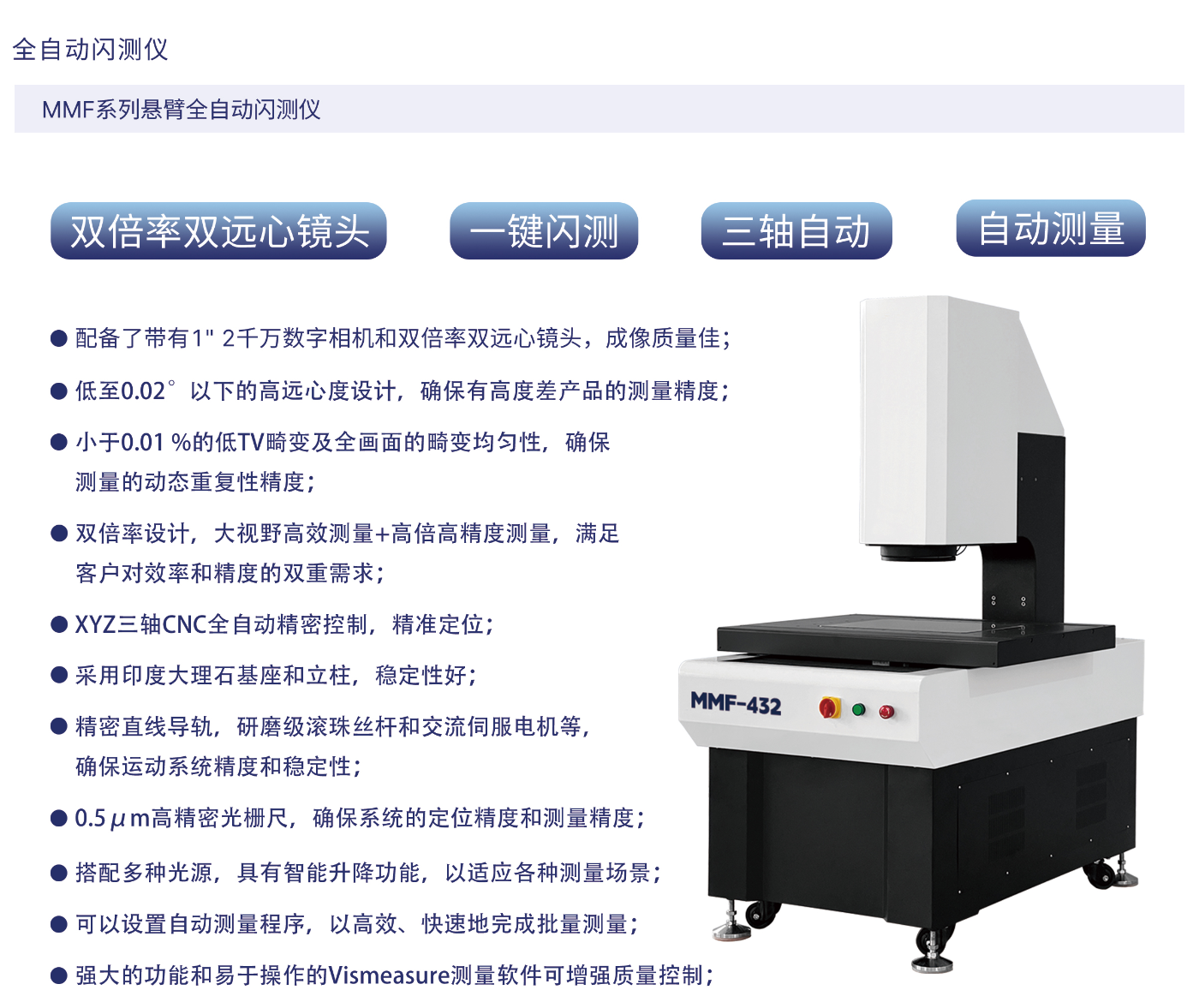 MMF系列是一款悬臂型高精度全自动视觉测量仪,专为具有三轴自动电动控制的GD&T测量而开发。 它配备了自动聚焦,自动照明控制以及硬件和软件配置的自动移动,可以快速,准确地测量线性和几何尺寸。